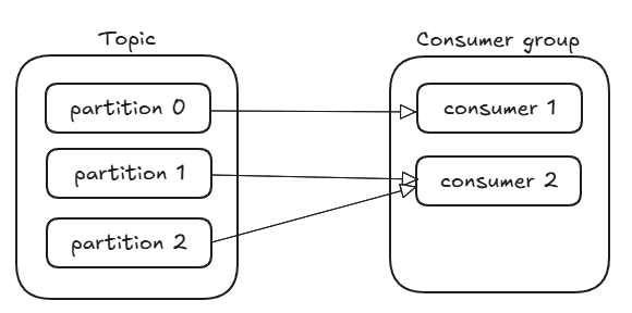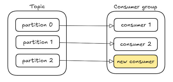 This initiates a rebalance. Kafka assigns one partition to the new consumer along with its offset information, allowing it to pick up where a previous consumer left off. The new consumer now handles one partition, while the others remain with the original group members.